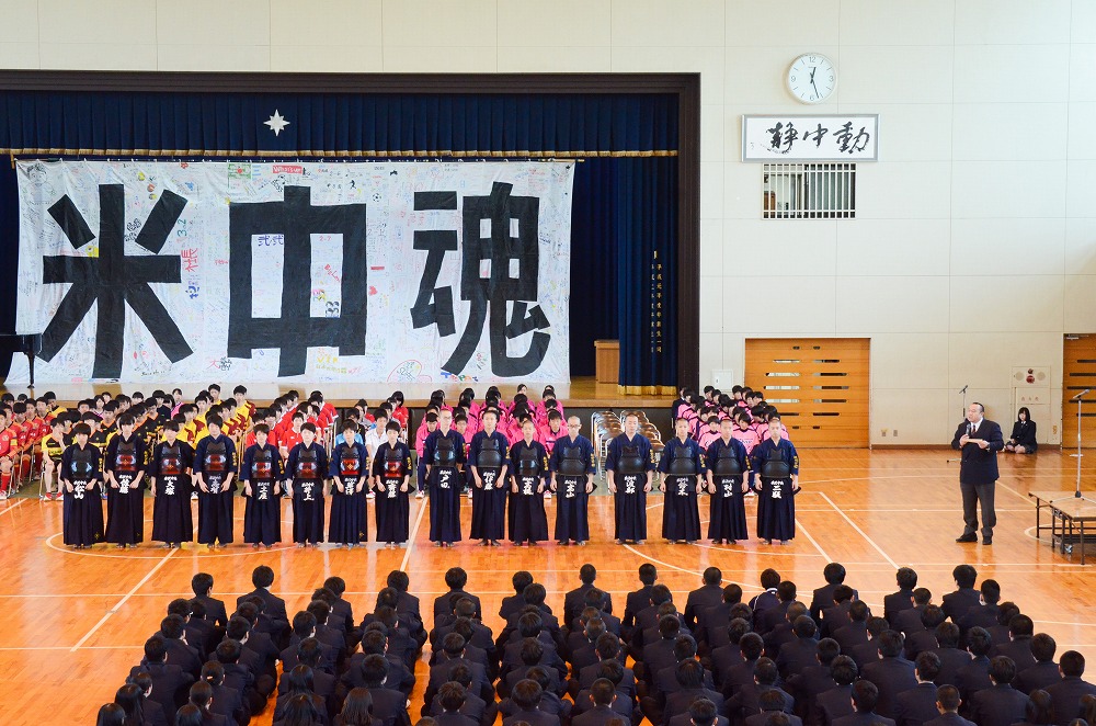 体育館には先輩たちがそのもとで頑張ってきた歴代のビックフラッグ「米中魂」、「青春中央」、「ONE」、「破天荒」、「中央魂」が掲げられ、5月12日から行われる置賜地区高校総体の壮行式が行われました。