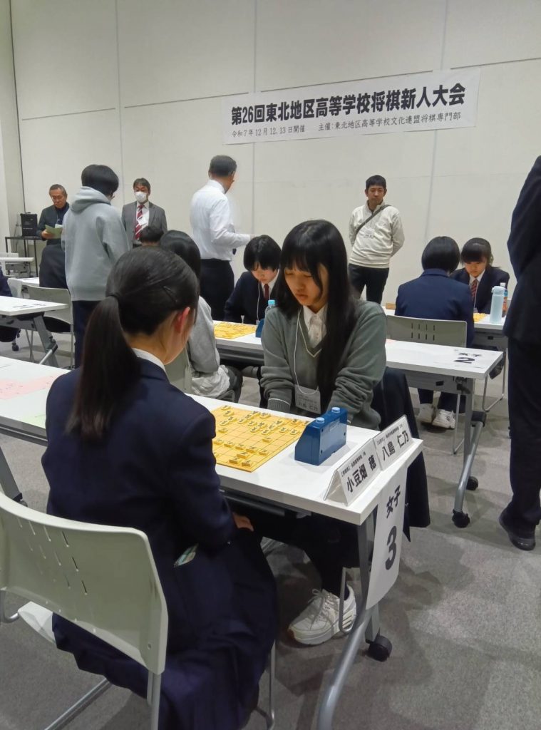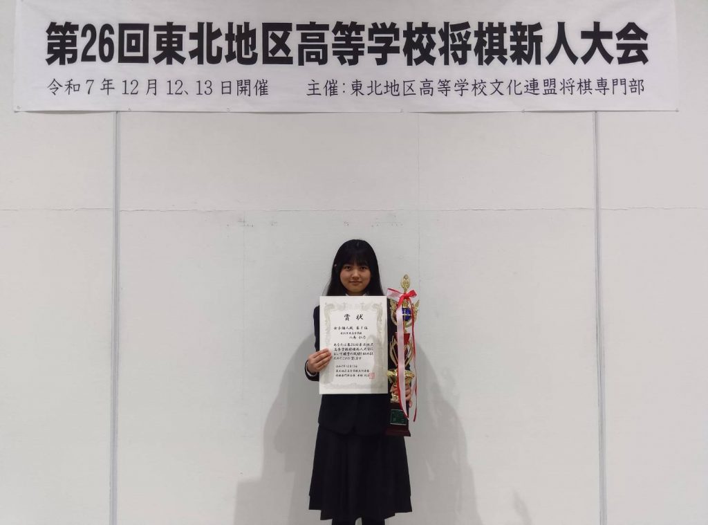 第26回東北地区高等学校将棋新人大会 八島仁乃 2025年12月22日 最終更新日時 : 2025年12月22日 管理者 八島仁乃 優勝(2連覇) 12月12日(金)~13日(土) 第26回東北地区高等学校将棋新人大会(会場:青森県青森市 東奥日報新町ビル 3F New’sホール) 昨年に引き続き東北地区高等学校将棋新人大会において2年生の八島仁乃が優勝し2連覇を達成することができました。1月には山形県開催で第34回全国高等学校文化連盟将棋新人大会があります。良い結果が残せるように頑張ります。